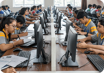At the secondary school level, eTechno promotes cohesive learning through the innovative 4Cs Approach—Critical Thinking, Creativity, Collaboration, and Communication. With dedicated mentors and regular PTMs, eTechno keeps parents engaged in their child’s journey. Error Analysis boosts academic improvement, while the Olympiad Programme prepares students for national and global competitions.
